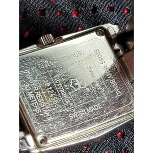 For sale is a stylish Swiss Army watch featuring a white face with black numbers and a silver band. The watch face has a distinctive red shield logo with a white cross at the top, adding a touch of elegance. The silver band is made up of rectangular links, giving it a sleek and modern look. This watch is perfect for anyone looking for a classic timepiece with a touch of sophistication.