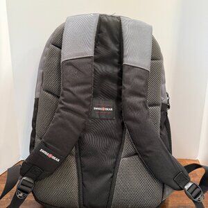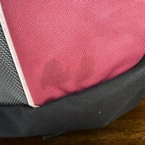 This raspberry and gray Swiss backpack has been used, but is in wonderful condition. Stain on front and pull in back shown in photo. This sold for $60 on the Office Depot website (https://www.officedepot.com/a/products/163196/SwissGear-Sun-Backpack-With-16-Laptop/).
