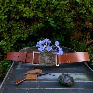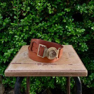 Cool kids have fresh eyes and a flair for the unexpected. They're inventive, open minded, and are inclusive. They tend to reuse, incorporate the obsolete, the inherited, and forgotten things with the new, to create their own unique look. Switzerland's trilingual Boy Scout motto "Allziet Bereit - Toujours Pret - Sempre Pronto" (Always Ready) represents Swiss Scouts of German, French, and Italian descent from different regions. This vintage interlocking fleur-de-lys insignia belt with the honey hued leather strap is the exclamation point to that ordinary pair of khaki, jeans, or white pants. Circumference measures approximately 34", leather strap 32", width 1.25", EU size 95. There's some age appropriate tarnish on the brass buckle, and the leather strap has a few minor hard to see blemishes, otherwise the belt is in excellent condition.