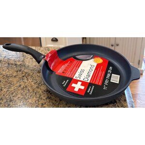 Great for larger jobs around the kitchen and a cast aluminum helping handle,. The cookware's flat bottom provides even heat distribution and accommodates all ceramic, electric, and gas cook tops. The Fry Pan's stay-cool ergonomic handle ensures a secure, comfortable grip, and the pan can be washed in a dishwasher for easy cleanup. The Swiss Diamond Fry Pan and is oven-safe up to 500 degrees F.