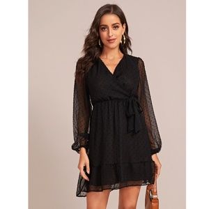 Black V Neck, Surplice (Not wrap) Short, Mini Elastic Waist Waist ties A Line Ruffle Hem Long Bishop Sleeve Lined Sheer sleeves 100% Polyester Fabric has no stretch Available in Baby Blue in a separate listing See photos for measurements Tags summer romantic date wedding bridesmaid vacation event cute party bachelorette cocktail evening girls night out graduation formal sexy valentine's cruise chic pageant holiday new years eve birthday prom special occasion photoshoot dinner