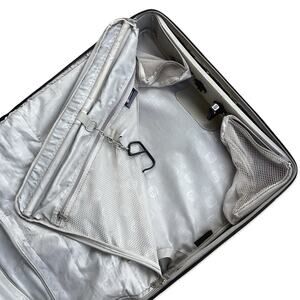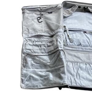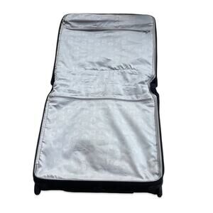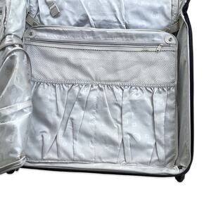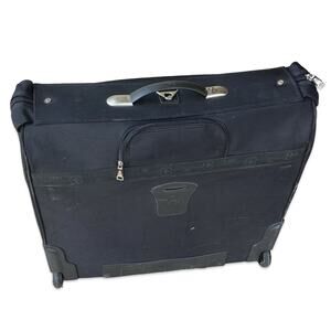 Good preowned condition. Missing zipper pulls on the outer pocket (zipper still works). Some smudges on the garment insert (probably washable). Signs of use on outer shell (minor). Rolls great. Features smoothly working telescoping handle and tons of organizational pockets.