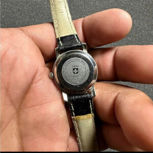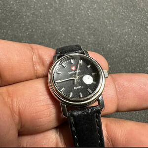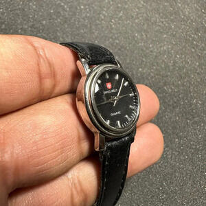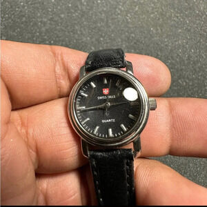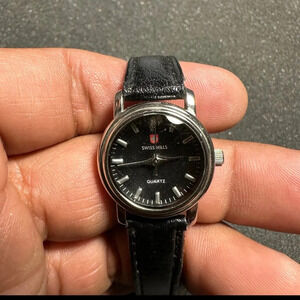 Swiss Hills Ladies Quartz Watch Silver Tone Case Black Dial Black Band Working shows signs of wear such as scratches on case and crystal see pictures for reference