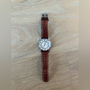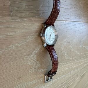 White dial with silver tone, white and black hands and silver tone hour markers and roman numerals; luminous; screw-down crown; sapphitek crystal; stainless steel case; brown leather strap