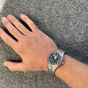 The watch is in great pre-owned condition! I don't know much about watches. I could not figure out how to get the watch's time movement to move. I am not sure if this watch needs a new battery or a repair. I don't know the specs on this watch but I put the watch on my 6.5" wrist as shown in the photos. The watch comes with two other links.