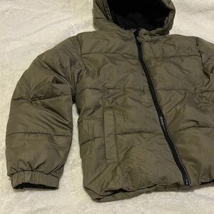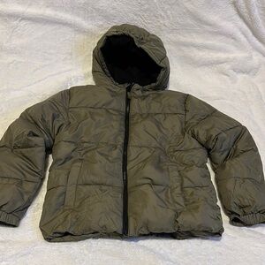 Stay warm and stylish with the Swiss Tech Green Puffer Jacket, featuring a quilted design and insulated padding for optimal comfort. This weather-resistant coat is perfect for chilly days, offering both functionality and a sleek look. The attached hood adds an extra layer of protection against the elements. Size large 10-12 “g2”