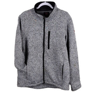SWISS Tech Men's Grey Black Marble Pattern Funnel Neck Long Sleeve Full Zipper Front Closure Waist Length Medium Weight Athleisure Knit Jacket. Shell: 100% Polyester. Chest Zipper Pocket. Two Lower Open Side Pockets. Front/Sleeve Spots. Size Large (42/44)