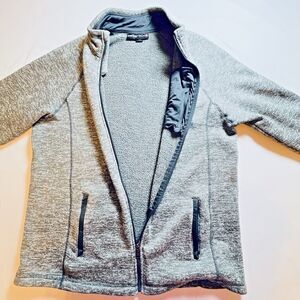 For sale is this mens Swiss Tech full zip sweater jacket, size large. This fleece-like gray sweater features full zip pockets. Very good condition. No holes, tears or stains.