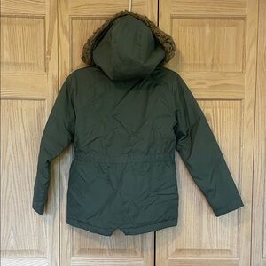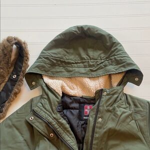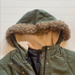 Warm utility jacket with faux fur hood. Fur is removable for a different look. Perfect for chilly days.
