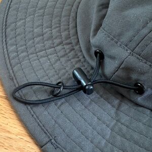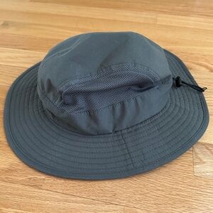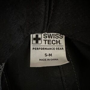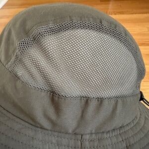 Swiss Tech Performance Gear Sun Hat with Neck Flap Size S/M. Foldable and packable. Dark green (color is accurate in first pic) hat with an adjustable interior hat band. Attached neck and ear flap that can be tucked inside the crown of the hat when not wanting to use. Air vents on each side of the crown. Heavy cord chin strap that is adjustable. Sweat wicking interior band. Brim: 3"; crown: 4.5". Size Small/Medium. Unisex. Excellent, clean condition.