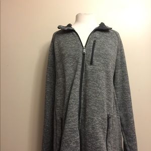 Full zip. Excellent used. Very soft inside. Zipper breast pocket. Dark Heather grey. Regular zipper pockets. Fits XL and some XXL.