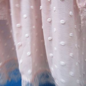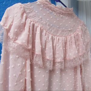 Swiss dot pink ruffle blouse with front buttons and lace detail