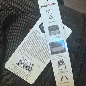SwissGear travel dopp kit in black. Includes hanging hook and multiple compartments.