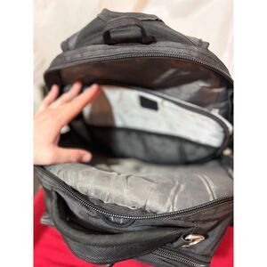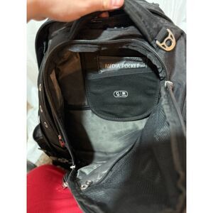 Durable SwissGear black laptop backpack with custom Spinitar patch on the front. Features multiple zip compartments, padded laptop sleeve, media pocket, and airflow padded back panel for comfort. Great used condition with light signs of use. Zippers and compartments all fully functional.