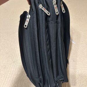 Great condition. Looks like never used. Great for your laptop and plenty of room and departments for your other things. Has zip pocket in back and you put straps in there and just carry with the handle. Size is 19 inches long and 17 inches wide. Great size.