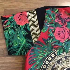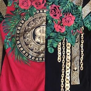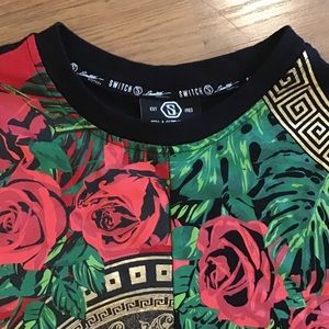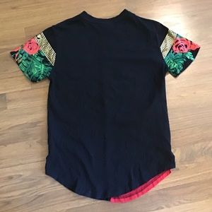 Tee shirt with red roses and metallic gold designs. Rounded hem.