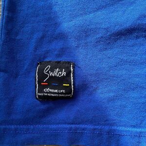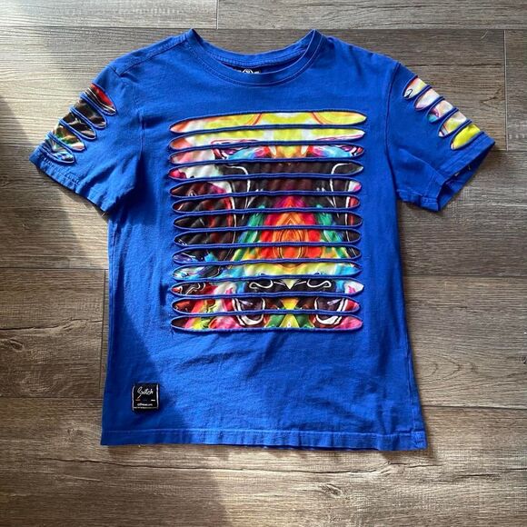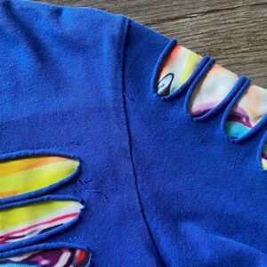 Stand out in this electric blue statement tee by Switch Remarkable! Features a layered design with vibrant multicolor graphic art showing through raw-edge slashes across the front and sleeves — giving off major streetwear + festival energy.