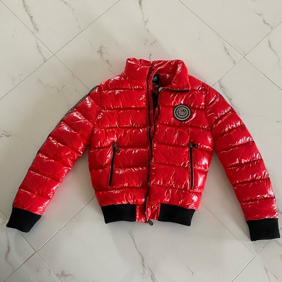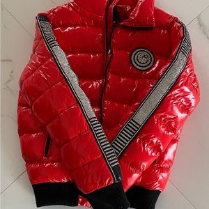 Never worn nice puffer jacket with Glossy outer shell. It is a Beautiful color and has dazzling accents of rhinestone/ crystals on the sleeves.