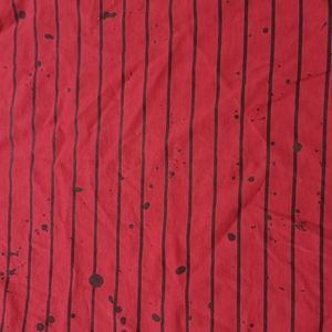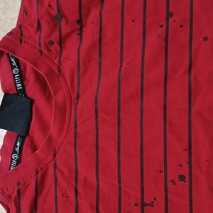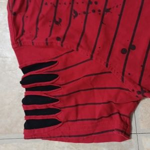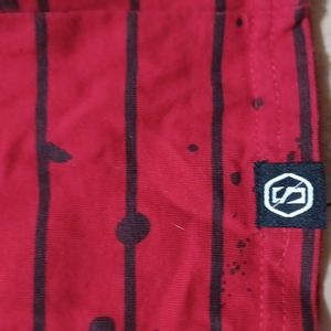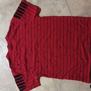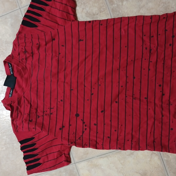 this is a switch hundred percent cotton t-shirt top but the round collar it's red black striping with black splatter short sleeves the sleeves have distressing where there have holes with black underneath it's really cute top the size medium for men's made in Bangladesh the measurements for the stop are approximately lying flat pit to pit 19 in across and the length is 24 in in really great condition