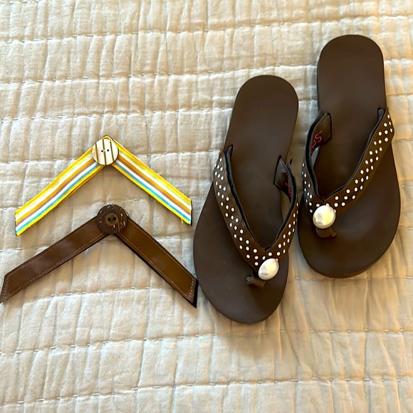 Like new, maybe worn once, Switchflop flip flops. Comes with 3 toppers to make different shoes. Great for travel! Comfortable.