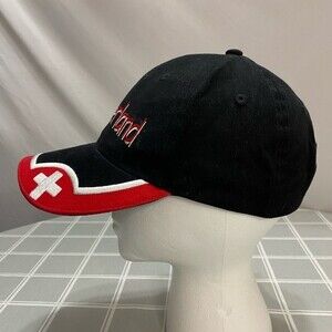 Switzerland Schweiz-Suisse Embroidered Hat Baseball Cap Slide Strap Metal Clasp 100% Cotton Black Red White Text & Cross Logos Embroidered in 4 locations Front, Side, Back & Brim