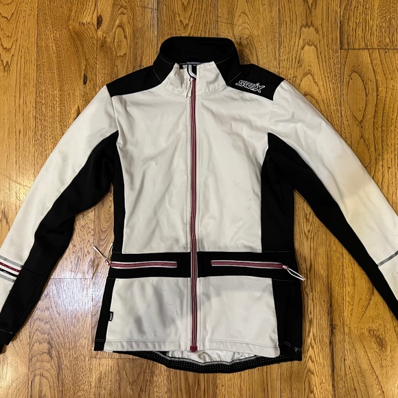 XS White, black and pink. Very minor stains front and back. For cross country skiing, offers protection and breathability. Soft finish and stretch panels on the back and under the sleeves for ease of movement and temperature regulation. A great looking, highly functional jacket that is ideal for cross country skiing!