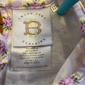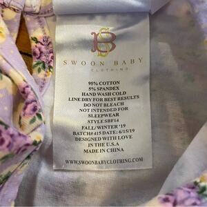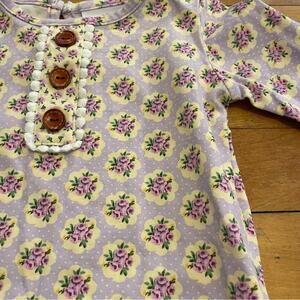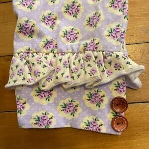 Size 12 months. Lavender with floral print. Wooden button detailing. Saddle snaps. Cotton blend. Possibly washed, but never worn.