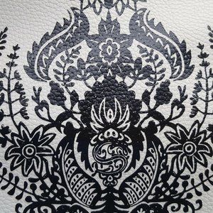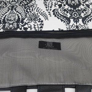 This is a black and white hanging makeup or toiletries organizer bag with handles by Swoop.