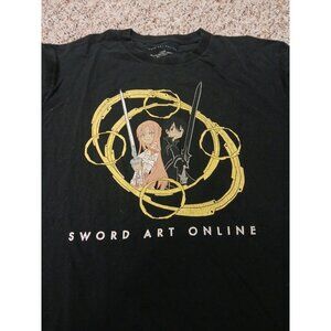 This Sword Art Online t-shirt features the iconic characters Kirito and Asuna in a unique design. Made of 100% cotton, this black tee is a must-have for any fan of the anime series. The shirt is a unisex size large and is perfect for any occasion, whether you're going out for a walk or attending a convention.