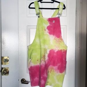 Unisex sweatshort overalls in pink and yellow/green neon tie-dye (called “pink lemonade”)