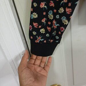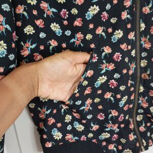 This lightweight floral bomber jacket offers a stylish touch with its multicolor print on black. Crafted with durability and comfort in mind, it is ideal for layering during transitional weather.