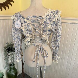 Sydney Lace Trim Floral Crop Top With Ruffle Detail & Lace-Up Back NWT M