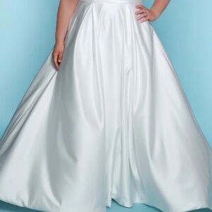 A-line satin gown with a modified sweetheart neckline and ruched bodice.