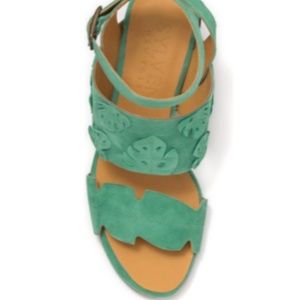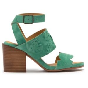 - Open toe - Leather construction - Leaf applique detail - Ankle strap with adjustable buckle closure - Lightly padded footbed - Stacked block heel - Approx. 3" heel, 0.5" platform - Made in Spain