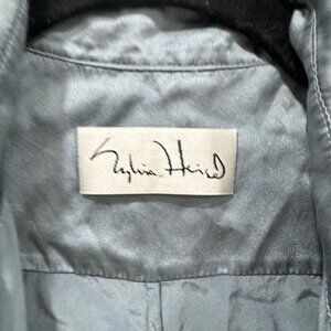 Elevate your wardrobe with this stunning Sylvia Heisel blouse. Crafted from 100% silk in a beautiful blue satin fabric, this blouse features a collared neckline and sleeves with button cuffs. The blouse is perfect for any occasion, whether you're dressing up for a party or dressing down for a casual day out. The button-up closure adds a touch of sophistication, while the accents and details elevate the overall look. This blouse is a must-have for any fashion-forward woman who wants to look her best.