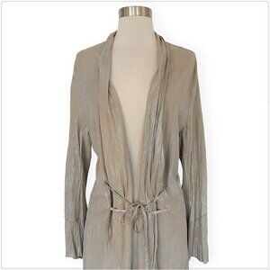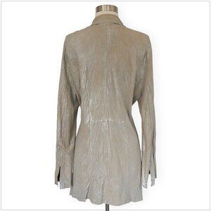 Tie front style to give it a fitted waist look. Tan goat leather with shimmery metallic. Lightweight leather with a wrinkled texture. Stunning piece!