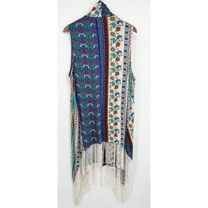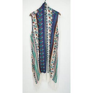 Symmetry Cardigan Vest Women 1 Ivory Blue Green Floral Boho Fringe Hem Western