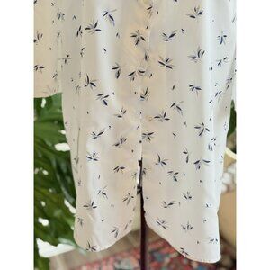 Elegant white blouse with black leaf pattern. Features a stylish bow tie collar. Perfect for formal occasions.