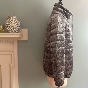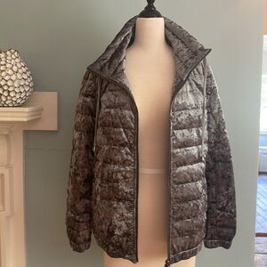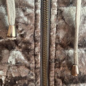 Bluish grey crushed velvet puffer jacket. Double zipper, side pockets. Drawstring at collar.