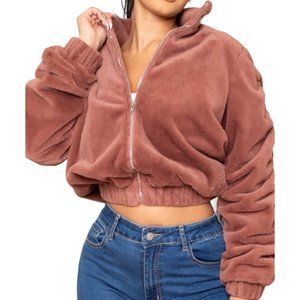 Symphony Plush Cropped Puffy Bomber Jacket Mauve Pink Size Large NWT