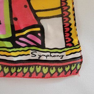 This 100% silk scarf features bright colors and interesting design. Symphony Scarves are made in Italy and you won't find this one anywhere else - is is rare and beautiful. The human figure is wearing earrings and a necklace and colorful apparel. The scarf measures 19 1/2 inches square and is in perfect condition. It is spotlessly clean and the rich colors make it a treasure.