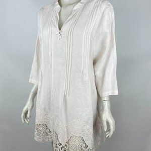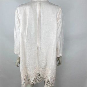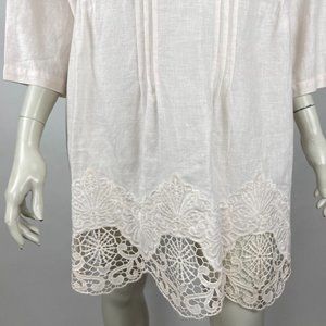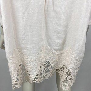 Symple NYC Flax Linen Tunic Women Embroidered Lace Hem 3/4Sleeve V-neck Top Pink