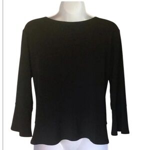 Sympli Go To Classic bell sleeve top in black. Round neckline. 3/4 sleeves. Ruffle panel hem. Wrinkle free. Lightweight jersey knit. Hand wash. Bust 19” waist 17” length 21” Excellent condition. Size 8. *** stock photo in red to show details only. Top is black.