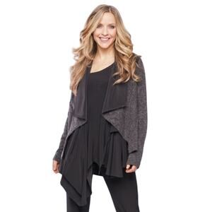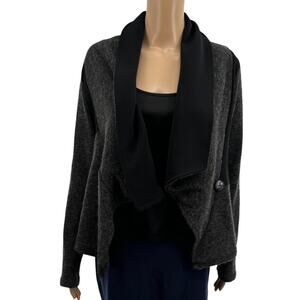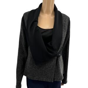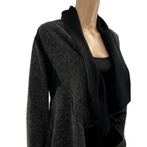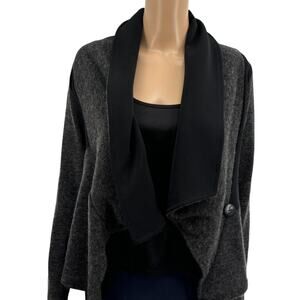 Gray cardigan sweater with black fabric panels from Sympli. Can be worn open or buttoned. Shawl / drape collar. Long sleeves. Wrap style with two buttons, can be worn buttoned different ways. Fabric 1 is acrylic, nylon, polyester. Fabric 2 is polyester / spandex. Hand wash. Made in Canada. 78712. In preowned condition, does not come with a waist tie.