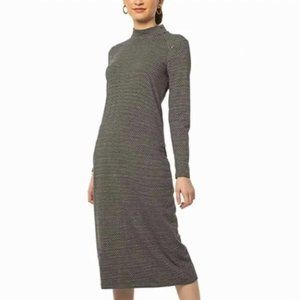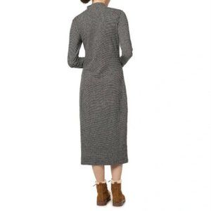 Soft and cozy midi dress from Synergy Organic Clothing. Dark grey fabric with light gray dots. Mock neck has button up the left side. 95% organic cotton.