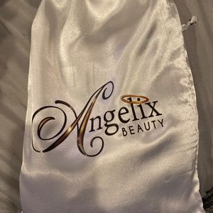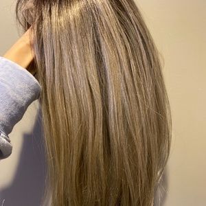 Synthetic lace front wig never worn. Asymmetricical bob cut ( longer on one side) darker at roots then fades to ash blonde color. Has clips inside and adjustments.