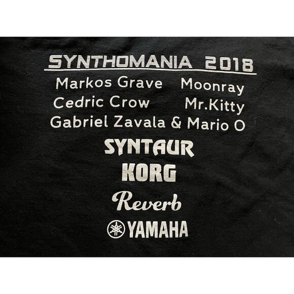 Celebrate the energy and spirit of Synthomania 2018 with this exclusive event t-shirt! Featuring a bold “I’m a Synthomaniac” graphic on the front and a detailed lineup on the back, this shirt showcases the participating artists and top sponsors like Korg, Yamaha, and Reverb. Made from durable heavy cotton by Gildan, this shirt combines comfort with a piece of synthwave history.