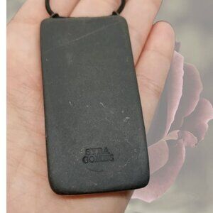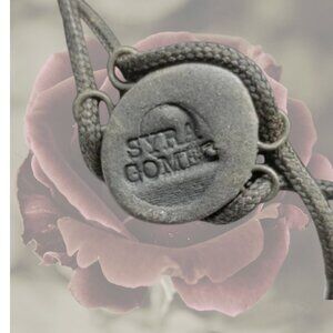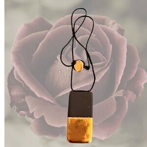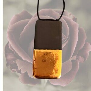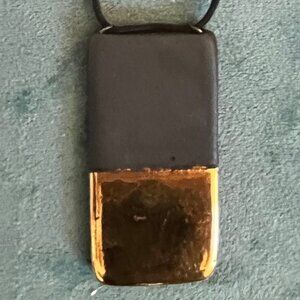 Syra Gómez artisan jewelry. She isn't really focusing on jewelry anymore - she focuses more on wall art now - so her beautiful pieces are rare and considered collectible. This one is a beautiful black porcelain with gold luster organic/rectangular pendant on an adjustable cord. The adjuster bead is also gold luster on one side. Her artist mark is on the back of the pendant and the adjuster bead.