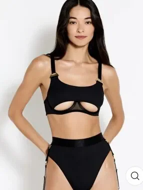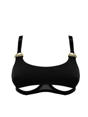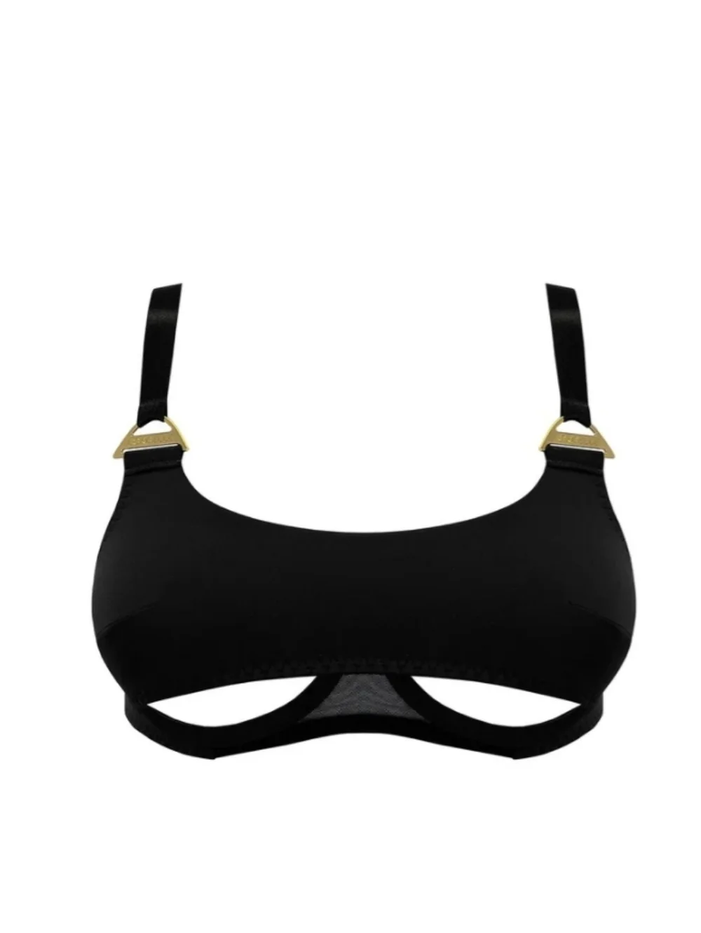 A super-soft jersey wire bra with underbust peep. The scoop neckline is connected to the shoulder straps via our new 24k gold plated oversized component. Wear at home or dare to show off when paired with outerwear.