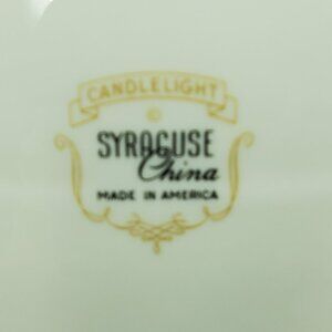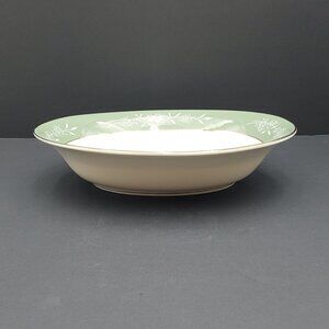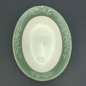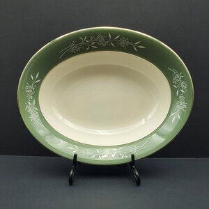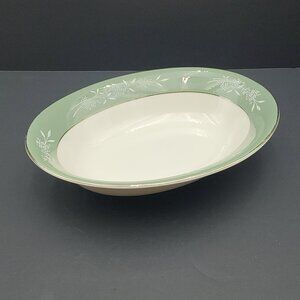 Syracuse China Candlelight Oval Vegetable Serving Bowl. Excellent pre-owned condition with a few faint scratches. 10" x 7-5/8" x 2.25" deep. This vintage pattern features a white bowl with white flowers on a green band with a platinum edge.